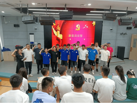 6月15日,足球学院学生党支部在智慧教室107召开“学思想、强党性、重实践、建新功”为主题支部主题党日活动,新党员入党宣誓,全体党员参加。