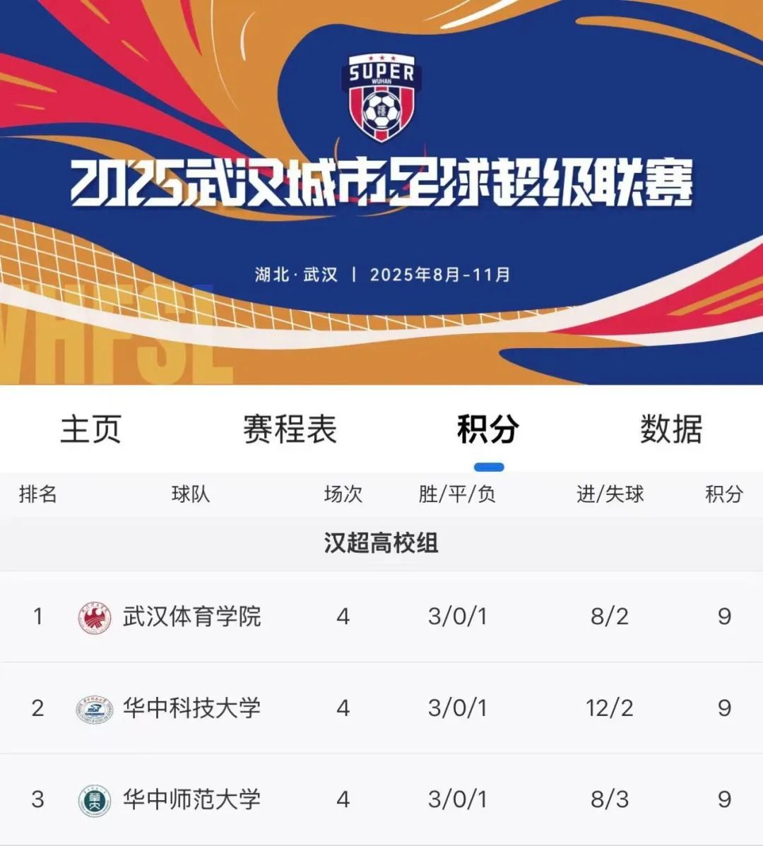 汉超(高校组)积分榜榜首