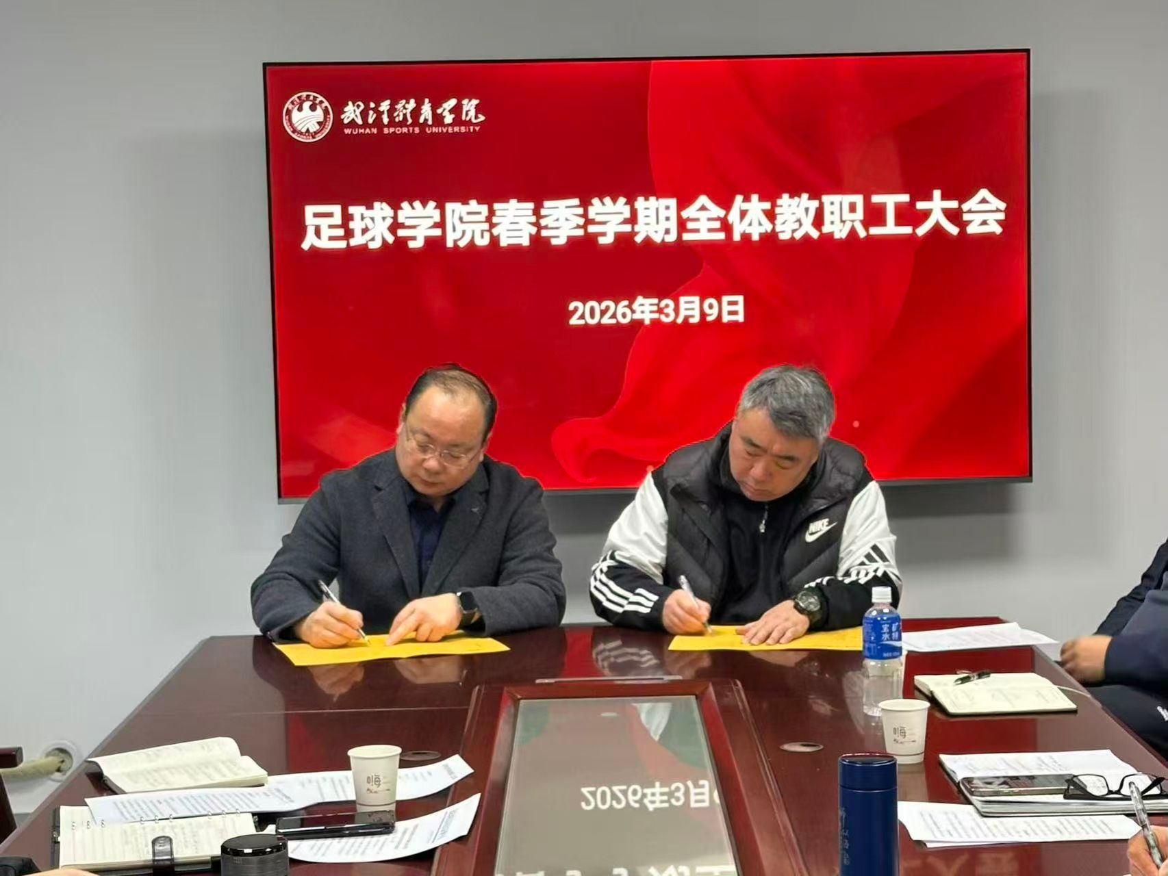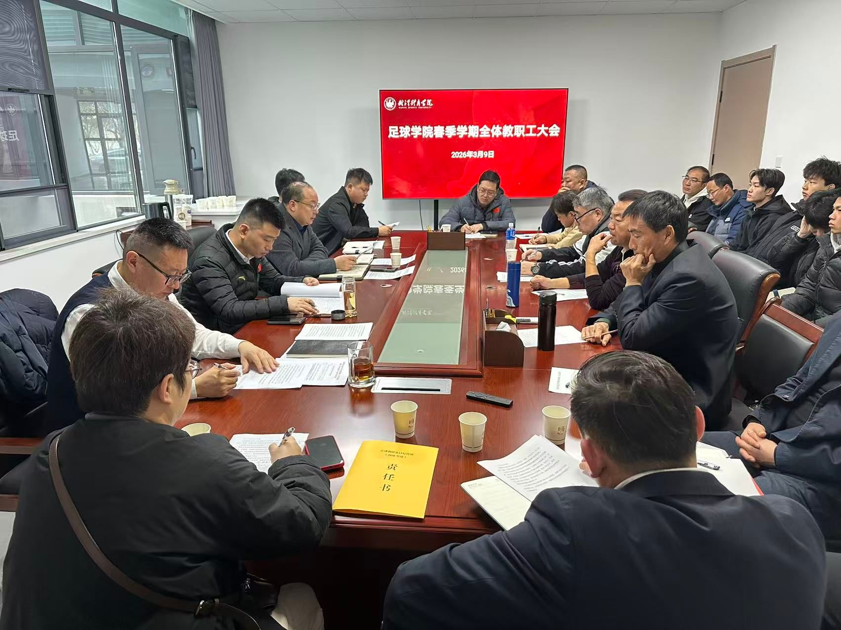 2026年3月9日上午,足球学院召开春季学期全体教职工大会。学校党委常委田霆到会指导并讲话,学院全体教职工参加会议。会议由学院党委书记王超主持。