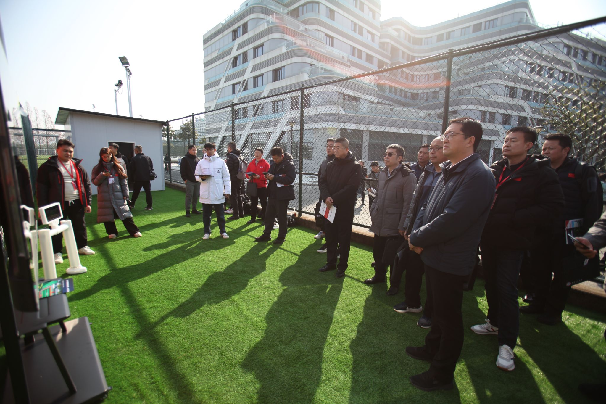 会后,与会代表集体参观了学校足球运动表现分析实验室,并现场观摩了室外智能足球场场景化训练系统演示。