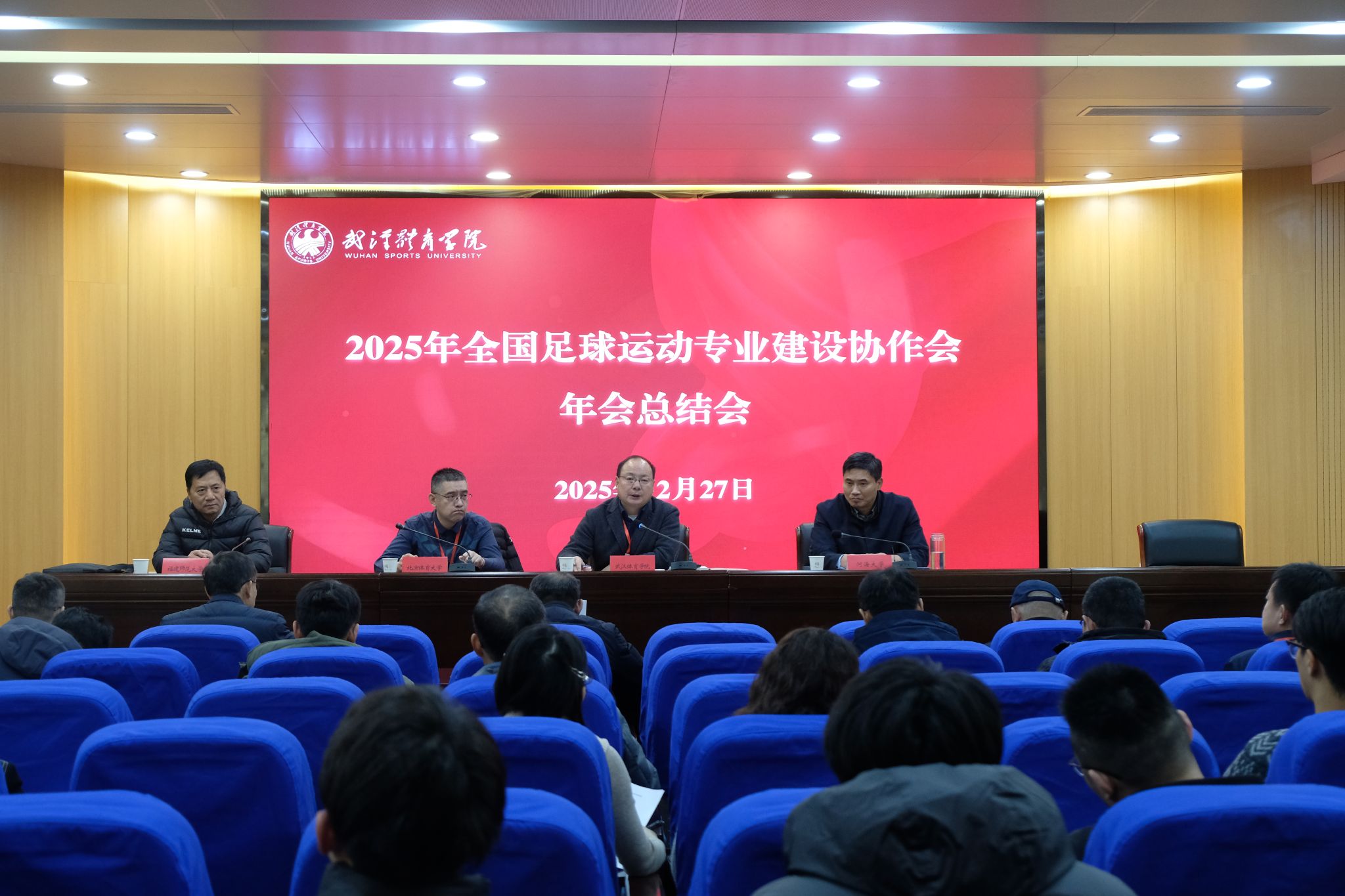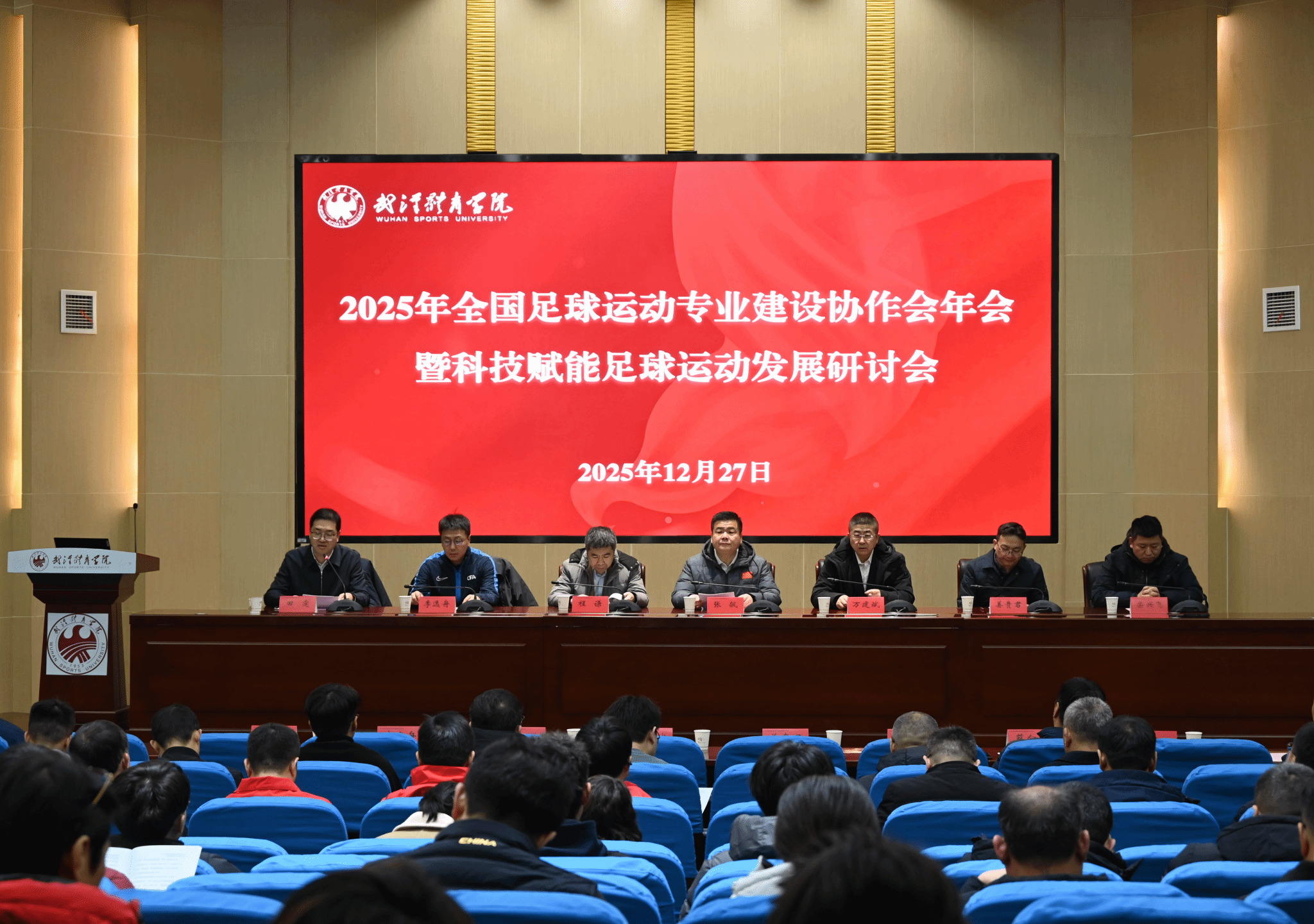 新闻网讯(通讯员张悦旺)12月27日,2025年全国足球运动专业建设协作会年会暨科技赋能足球运动发展研讨会在学校召开。中国足球协会副主席万建斌,国家体育总局科教司科技处处长程谦,国家足球青训中心总监李逸舟,湖北省教育厅体育卫生与艺术教育处副处长姜贵君,湖北省足球运动管理中心、足球协会副主任栾兴飞,校党委副书记、副校长张飙,来自全国40所高校足球运动专业的60余名代表,以及相关企业、武汉市中小学、新闻媒体代表和学校师生参加了本次会议。会议由校党委常委、组织部部长田霆主持。