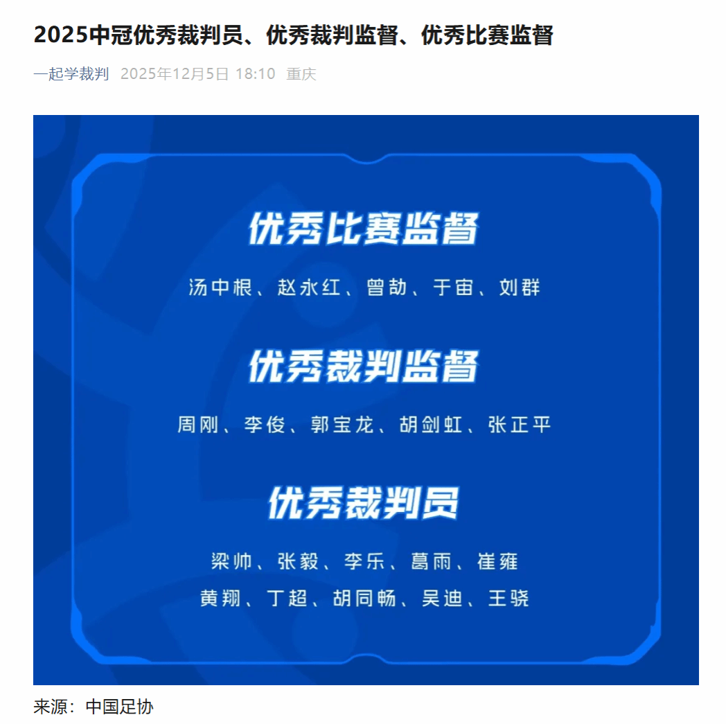 根据中国足协发布的表彰名单,周刚与李俊、郭宝龙、胡剑虹、张正平等五人获评“优秀裁判监督”。该评选旨在表彰在本年度中冠联赛中恪守职责、公正执裁、表现突出的裁判工作者,展现了中国足协持续推进裁判队伍专业化、规范化建设的决心。